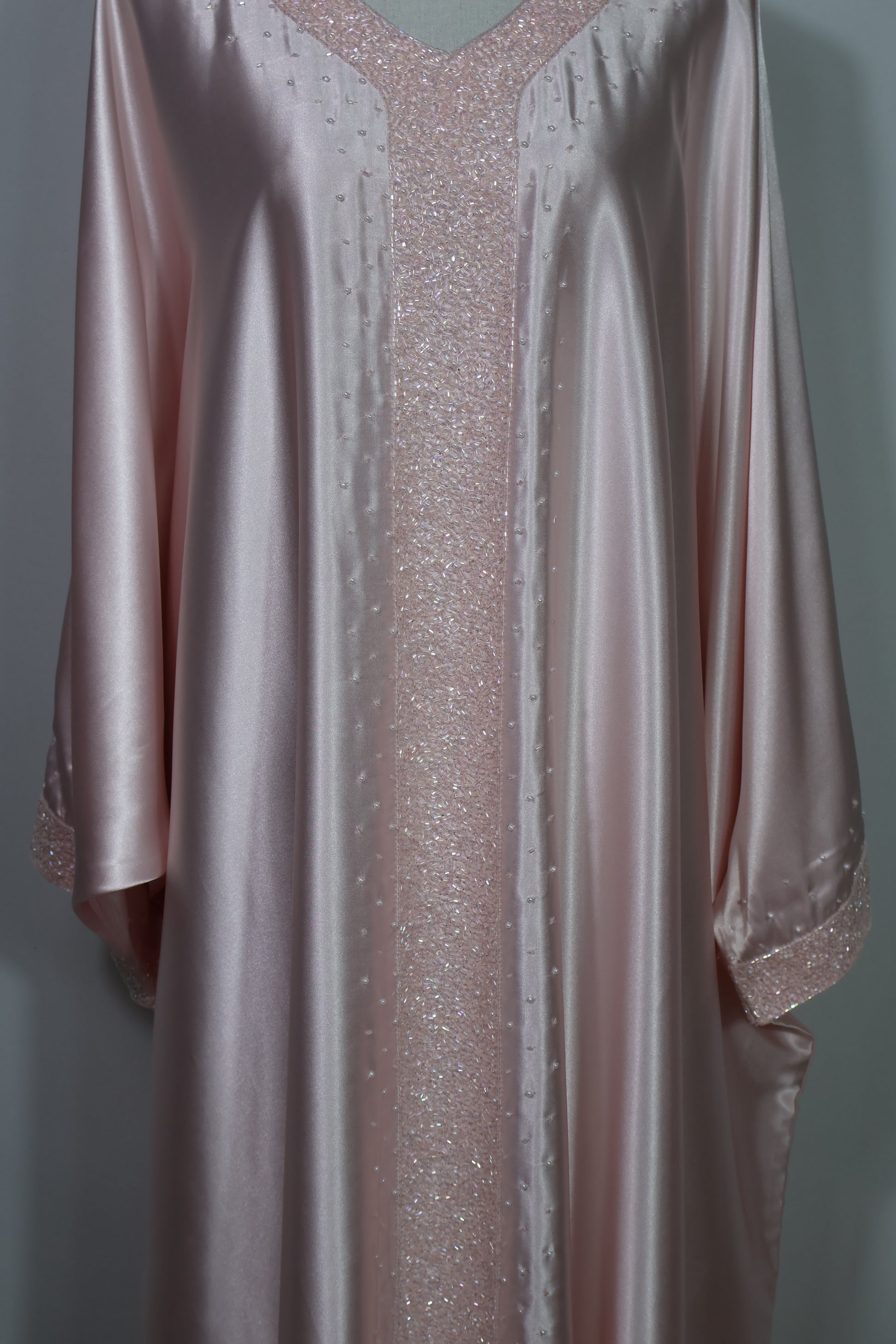 A delicately embellished central panel adds subtle shimmer, complemented by scattered hand-placed bead accents for understated sparkle. The V-neckline and gently tapered sleeves enhance the silhouette, finished with matching embellished cuffs.